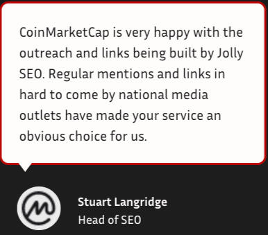 The techniques in this course are shaped by my sending 3,000+ pitches with a 1 in 5 win rate, and growing Jolly SEO to earn 25,000+ wins from 250,000+ pitches.Jolly's quality standards are by far the best in the industry. See the Head of SEO at CoinMarketCap's honest review to the right. You can achieve these same results with this course: